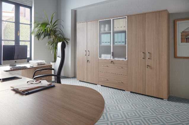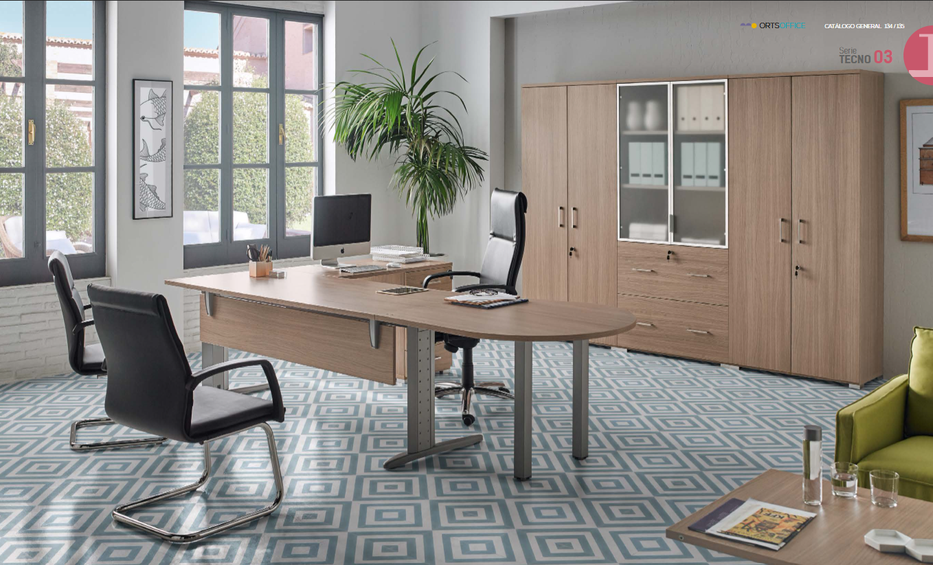 Conjunto de muebles oficina de la serie Tecno, parte del catálogo OrtsOffice17. diseñado y fabricado por Muebles Orts.